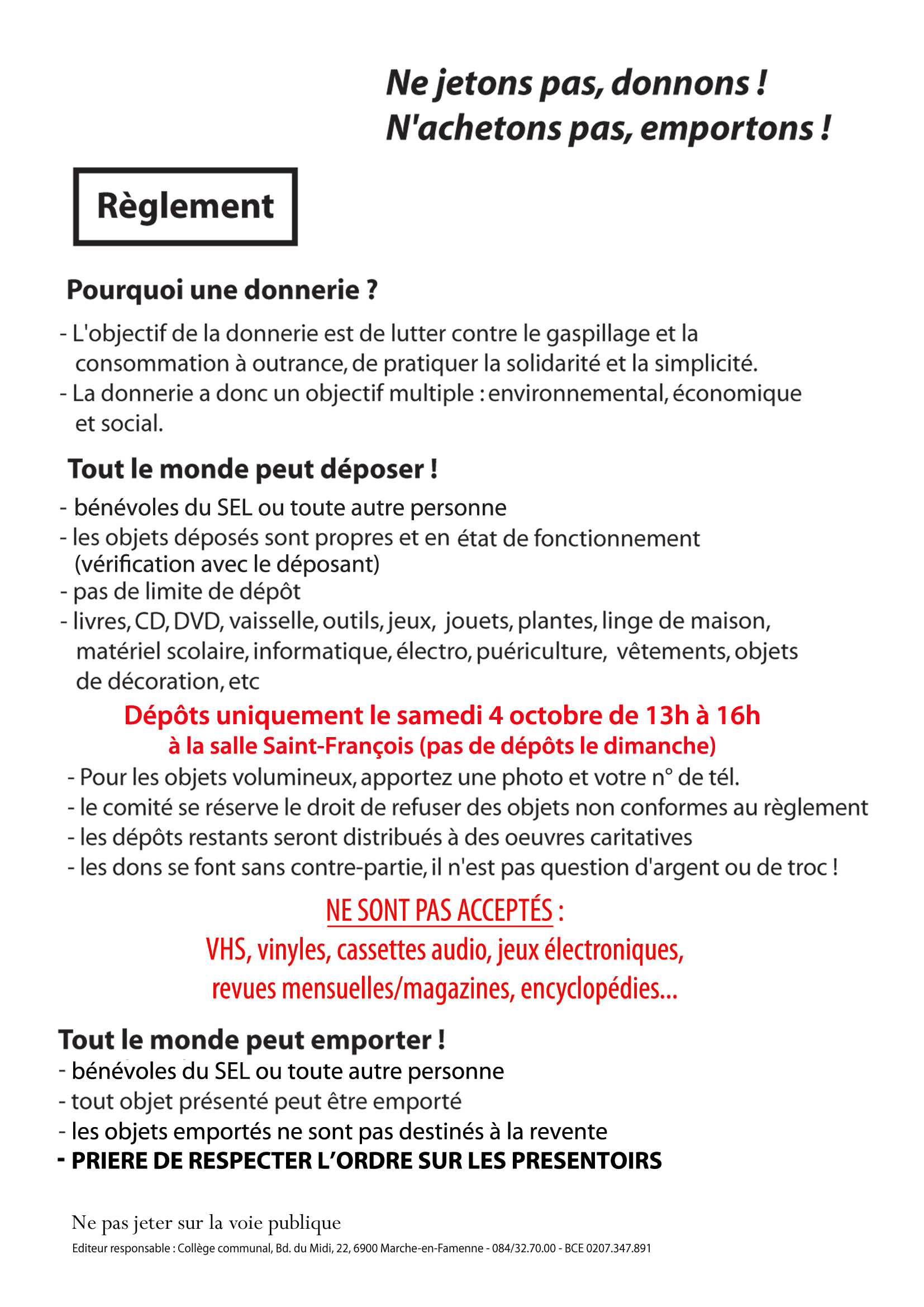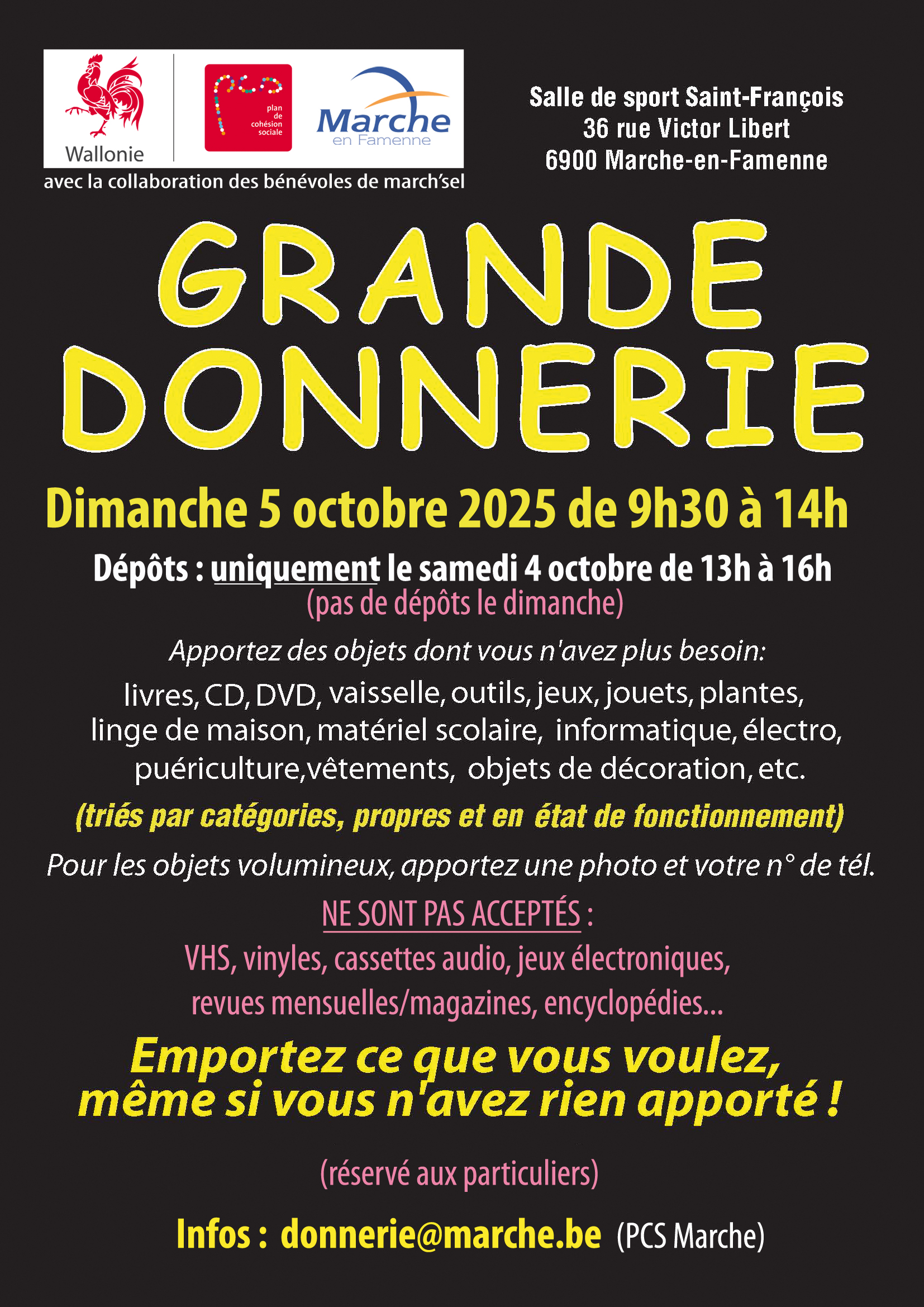 Vous souhaitez déposer des dons, vous êtes le bienvenu le SAMEDI 4 OCTOBRE à partir de 13H jusque 16H.
