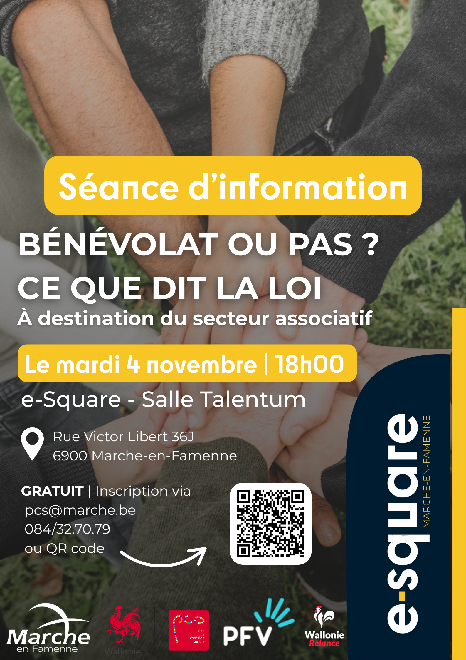 Lors de cette séance d’information, un·e intervenant·e de la PFV (Plateforme francophone du volontariat) fera le point sur le cadre légal du bénévolat en Belgique et répondra à toutes vos questions.